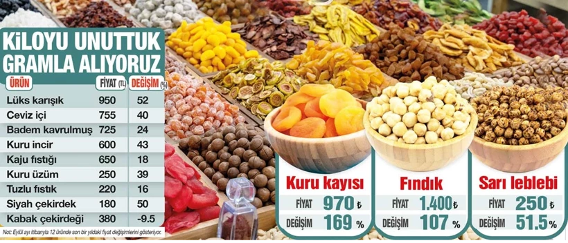 Kuruyemiş Sanayicileri ve İş adamları Derneği (TÜKSİAD) verilerine göre son bir yılda kavrulmuş fındık içinin kilogramı yüzde 107 artışla 675 TL’den 1.400 TL’ye, kuru üzüm fiyatı yüzde 39 artarak 180 TL’den 250 TL’ye yükseldi. Kavrulmuş badem yüzde 24 yükselerek 585 TL’den 725 TL’ye, kaju fıstığı ise 550 TL’den 650 TL’ye çıktı. Artış oranı yüzde 18 oldu. Ceviz içi yüzde 40 artarak 540 TL’den 755 TL’ye çıktı.