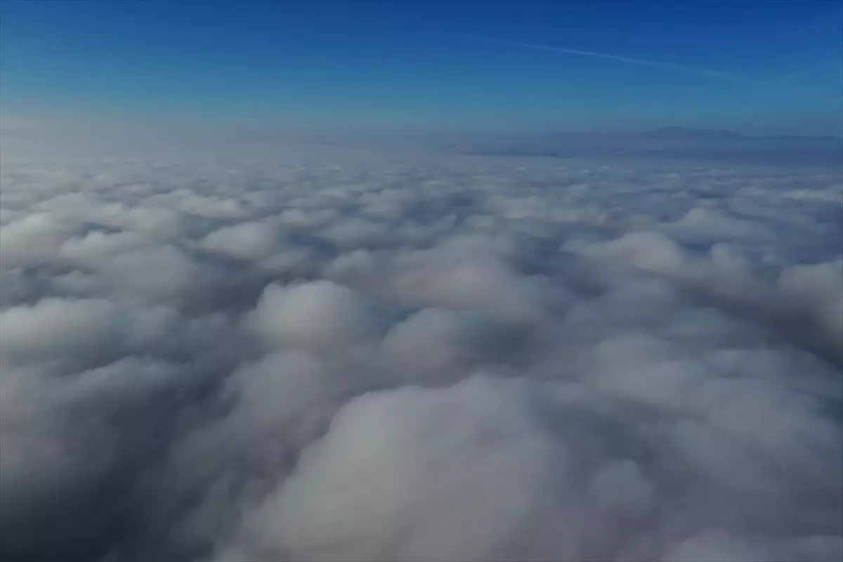 Sürücülerin araç farlarını açarak ilerlediği kentte, gökyüzünü kaplayan sis bulutu dronla görüntülendi.