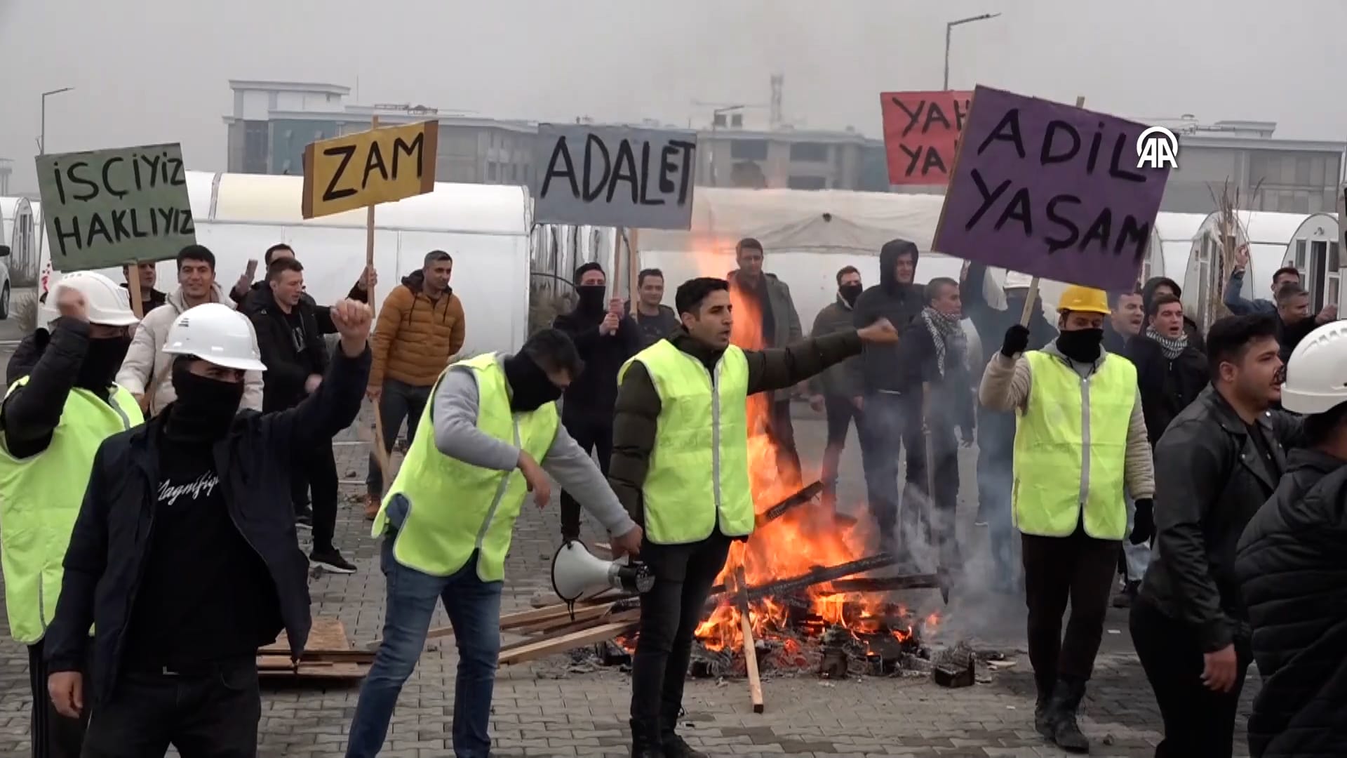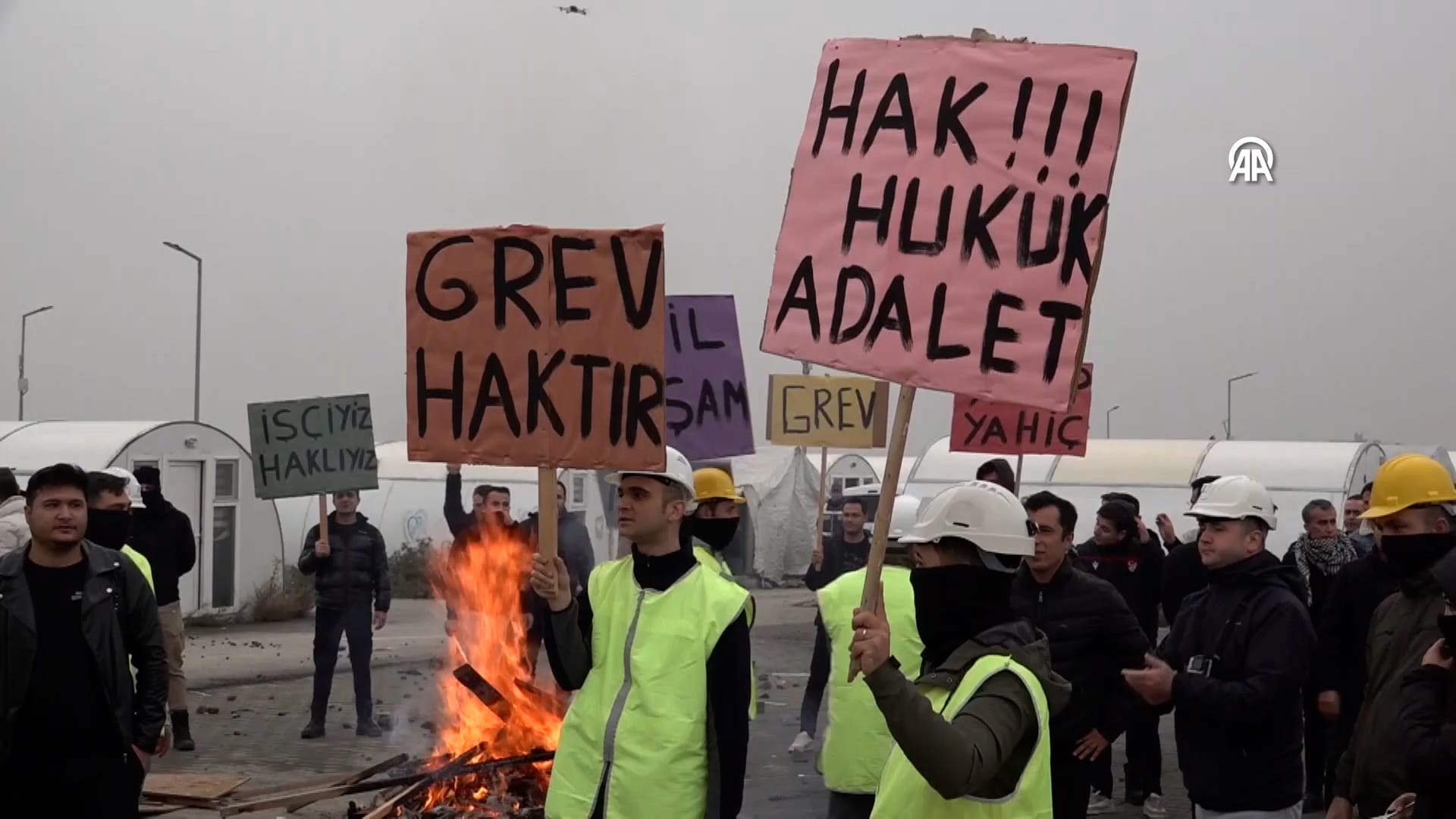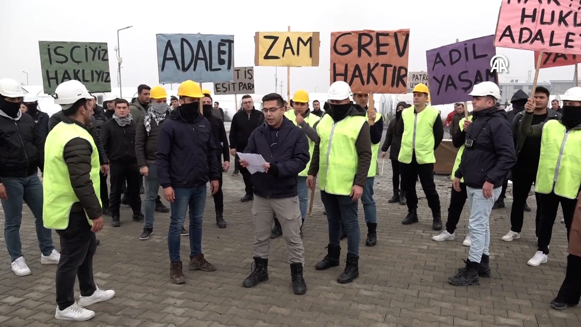 Grup, “Hak Hukuk Adalet”, “Adil Yaşam”, “İşçiyiz Haklıyız” ve “Grev Haktır” yazılı pankartlar taşıdı.
